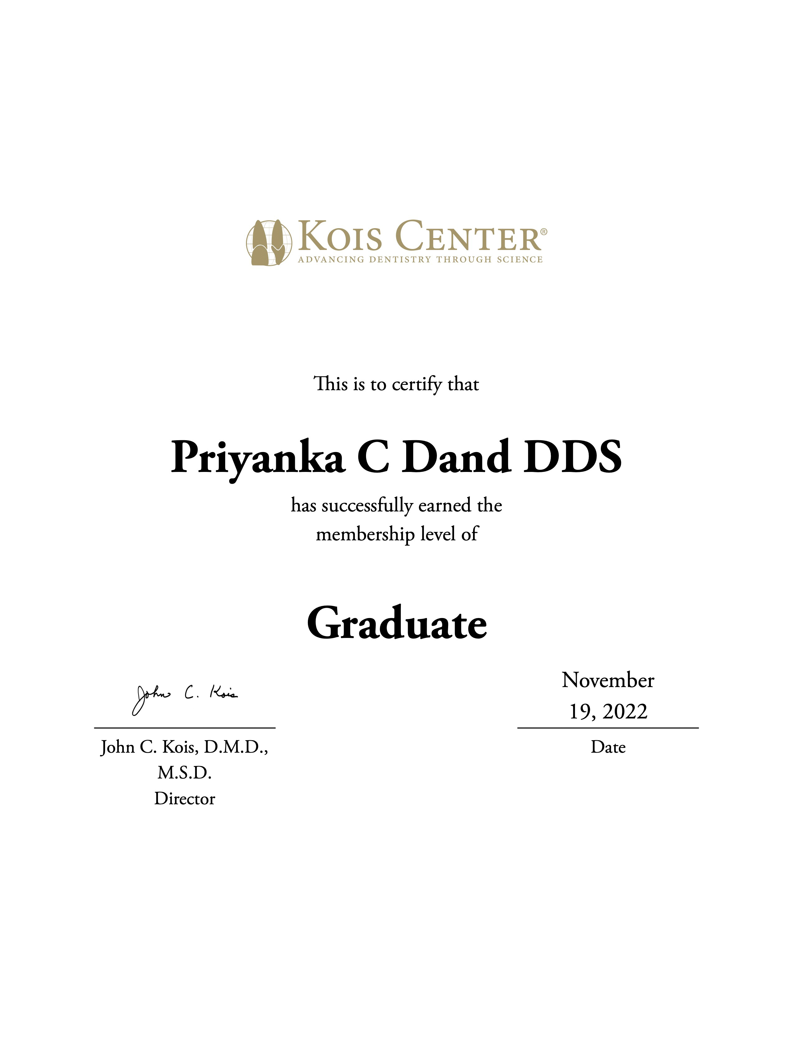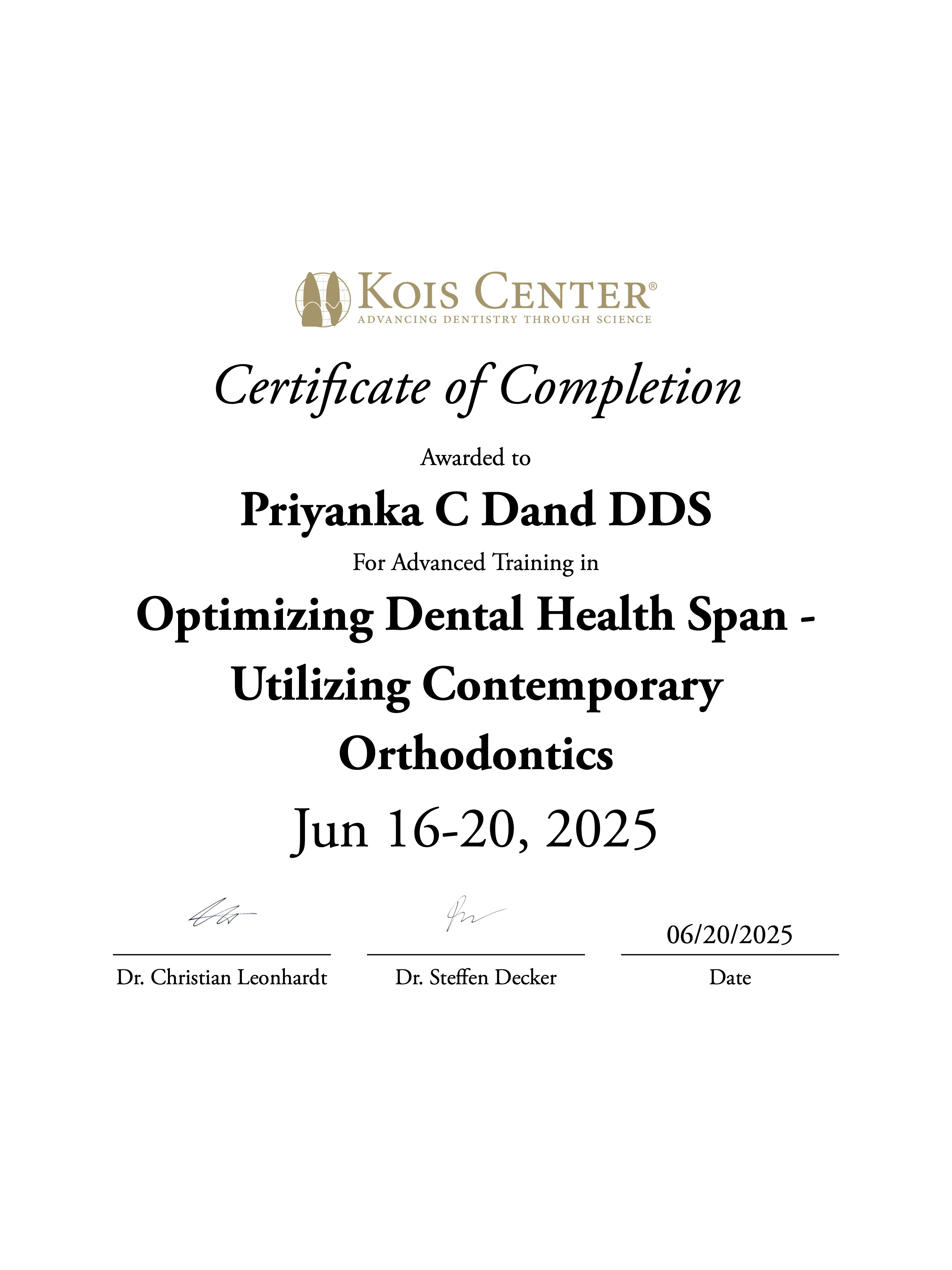 Dr. Dand’s extensive education reflects her deep commitment to excellence and patient care. After earning her Bachelor of Dental Surgery in Mumbai, she pursued a Certificate in Restorative Dentistry at the University of California, Los Angeles School of Dentistry. She went on to complete her Doctor of Dental Surgery at the University of Michigan School of Dentistry, graduating at the top of her class. A proud graduate of the prestigious Kois Center in Seattle, she is rigorously trained in comprehensive, integrative dental care.